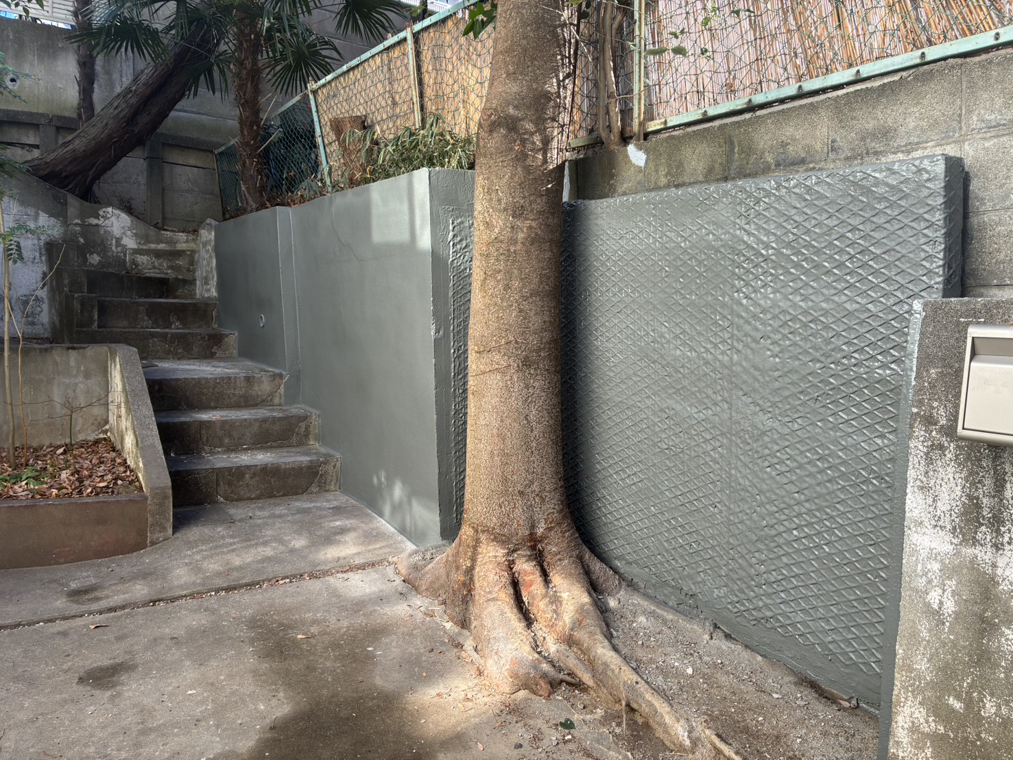 - 高さ2m前後の擁壁の上に、さらにブロック塀やフェンスを足している