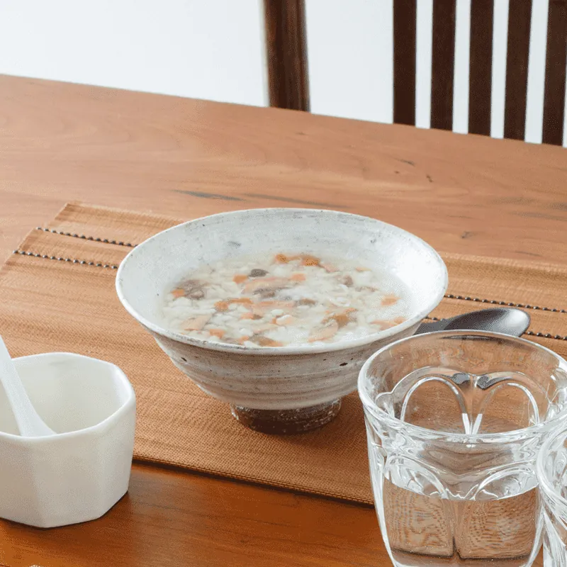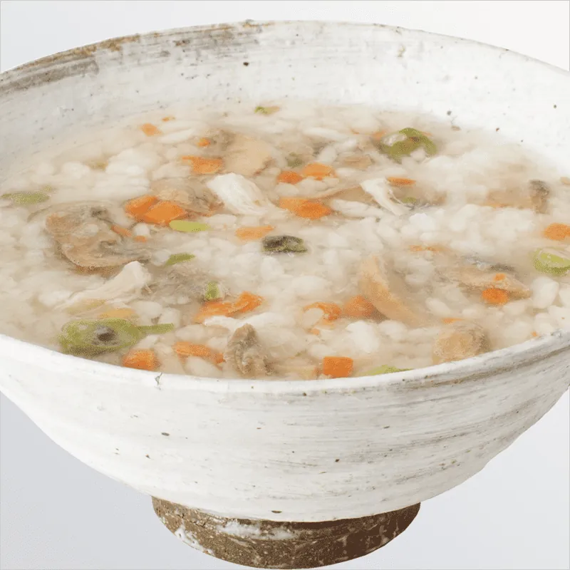 鶏肉、マッシュルーム、にんじんなどの具材とふっくらと炊き上がった国産米を、醤油、昆布だし、鰹だしで煮込みました。
