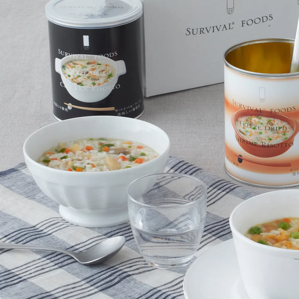米軍でも使われるフリーズドライ技術を応用し、最長25年保存を実現した“非常時でも妥協しない”レストラン品質の防災食です。