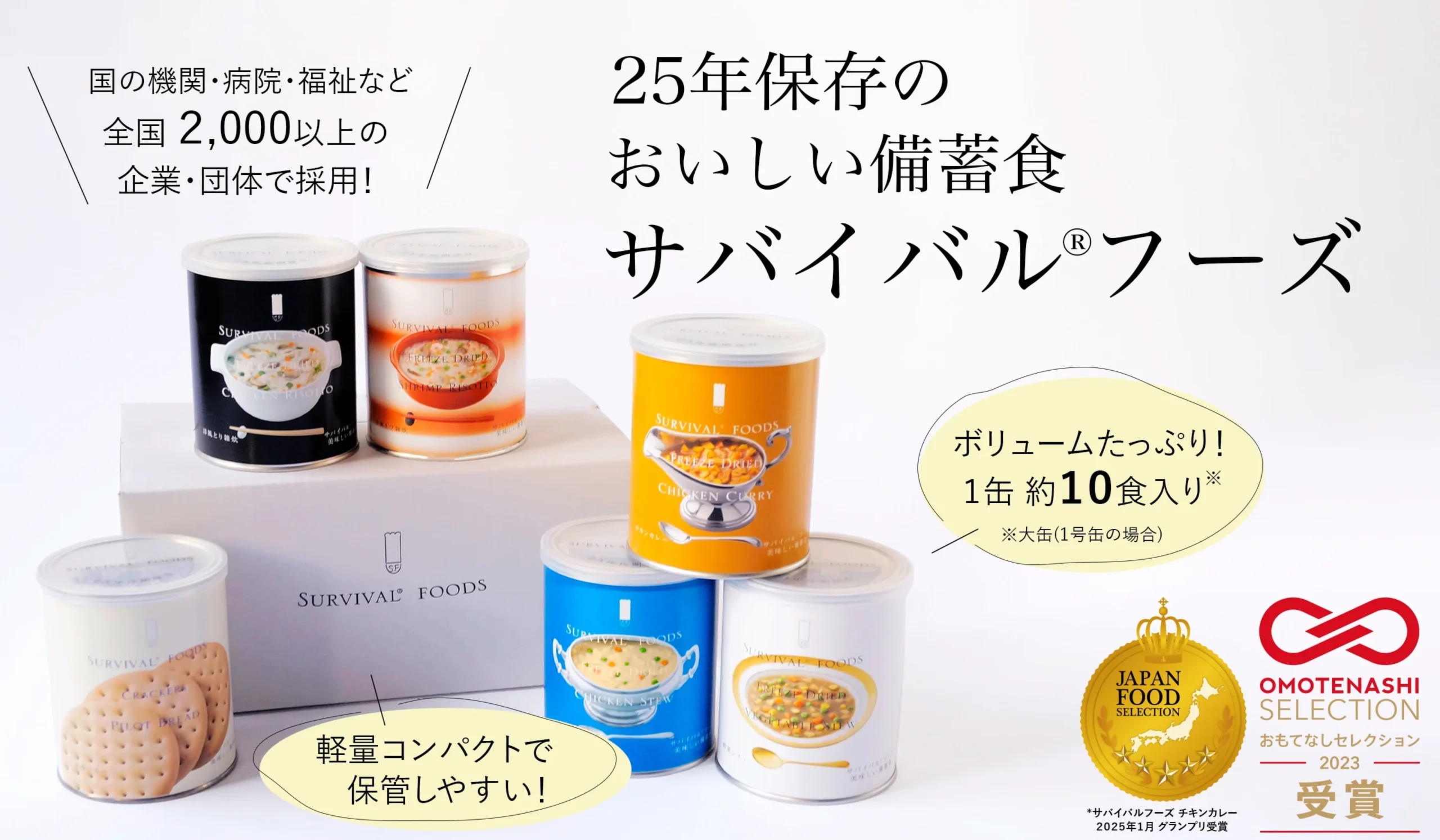 国の機関・病院・福祉施設など、全国2,000以上の企業・団体で採用されている長期備蓄食「サバイバルフーズ®」。