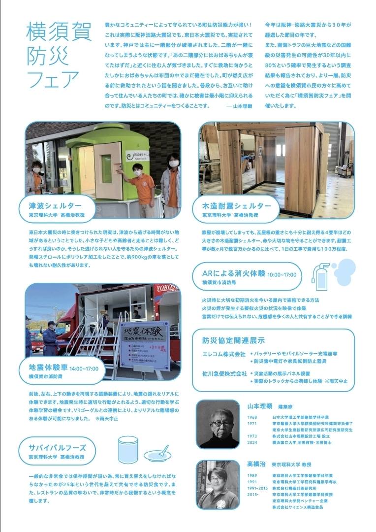 本フェアは、プリツカー賞受賞建築家・山本理顕氏の代表作である横須賀美術館で開催される「山本理顕展 コミュニティーと建築」と連動した、防災とコミュニティをテーマとする企画です。